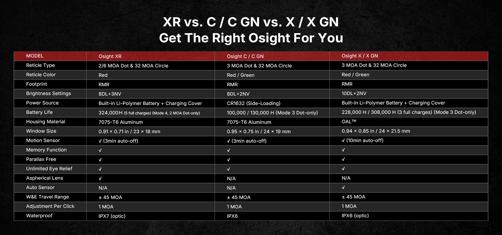 • Industryʼs First Patented Magnetic Charging Cover: The Osight XR brings a Patented Magnetic Charging Cover, the first and only of its kind in the industry, now upgraded with a redesigned form factor and integrated logo. It charges the optic while displaying real-time battery levels for both the cover and the sight, delivering innovation you can see and power you can trust.